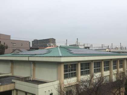 体育館の屋根に設置された「太陽光パネル」が、本日よりスタートしました!今朝は、雨がちらつく生憎の天気となりましたが、それでも、少しずつ発電していく様子が、事務室前のモニターで確かめることができました。