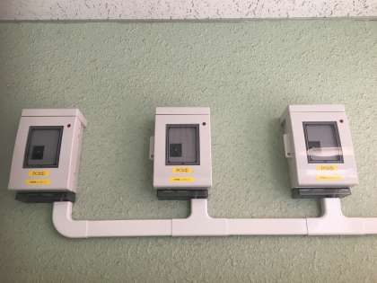 なお一番下の写真は、発電された電気を非常時にのみ使用できる電源です。体育館の入口付近にあります。