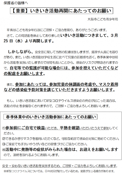 「いきいき活動」の再開について、こども青少年局から連絡があったので、お知らせ致します。「いきいき活動再開にあたってのお願い」は、下記の通りです。