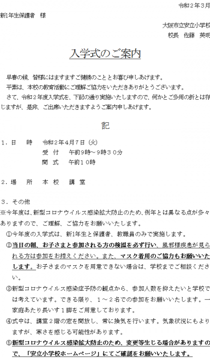 4月7日(火)の入学式について、大阪市教育委員会の指示による感染予防策を講じたうえで実施します。在校生や来賓の参加を取りやめて人数を抑えたり、時間を短縮したりするなど、例年とは異なる点が多々ありますが、現状をご理解いただき、ご協力をお願いいたします。