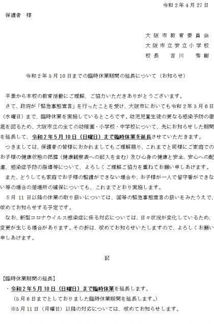 本日、大阪市教育委員会から休業期間を延長するとの連絡を受けました。