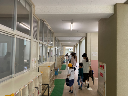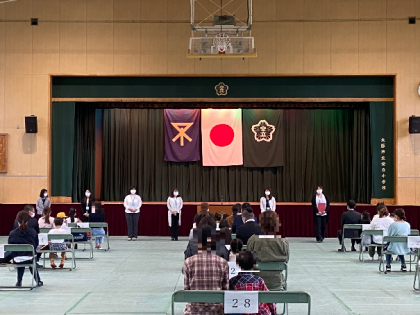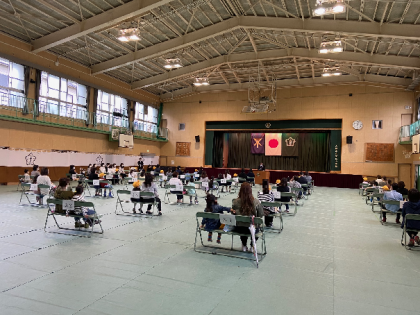 感染拡大を防ぐためために、登校時間を各学級ごと(3グループ)に分けて行ったり、椅子の配置や間隔を工夫したり、長椅子1台に保護者とお子様で着席してただいたりしながら、実施しました。