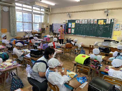 下記の写真は、小学校での「初めての給食」を食べる1年生の様子です。先生のお話をしっかりと聞きながら、美味しくいただきました。