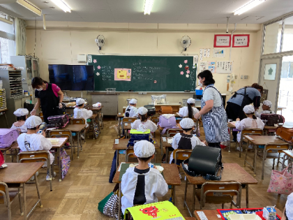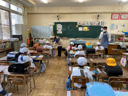 学校再開に伴い、「給食」もスタートしました。でも、現在は「分散登校」のため、午前の部と午後の部に分かれて、少人数で食べています。また、感染拡大を防ぐために、いろいろな手立てをとりながら、いつもと異なる形で行っています。