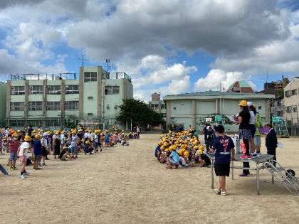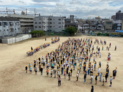 爽やかな空の下で、「1年生を迎える会」を行いました。かわいい1年生が、6年生のお兄さんやお姉さんと一緒に入場し、スタートしました。手をつなぐことができないため、横に付き添いながらの入場となりました。児童代表の子どもからの温かい「お迎えの言葉」の後、1年生全員から「よろしくお願いします!」と元気いっぱいの言葉がありました。その後「お迎えのゲーム」として、安立小学校についての「○×クイズ」で楽しみました。短い時間でしたが、ステキな時間を過ごすことができました。