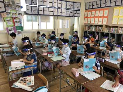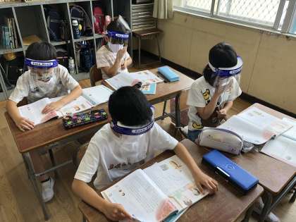 7月13日(月)大阪市から配付されたフェイスシールドを使って道徳の学習を行いました。子どもたちは、「かっこいい!」や「暑い!」と言いながらも、フェイスシールドを使う意味を理解し、学習に真剣に取り組んでいました。