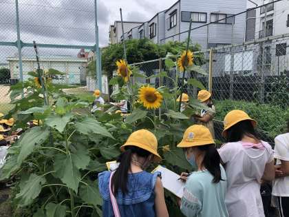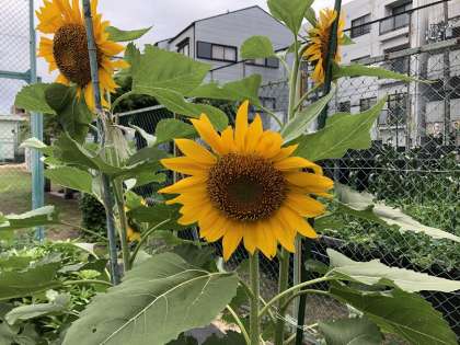 7月15日(水)理科で育てている「ヒマワリ」「ホウセンカ」「マリーゴールド」を観察に行きました。梅雨の隙間の晴れた時間を狙っての観察でしたが、見事な「ヒマワリ」に出合うことができました。ご覧ください!!