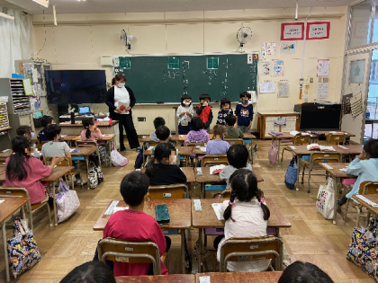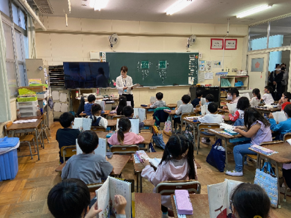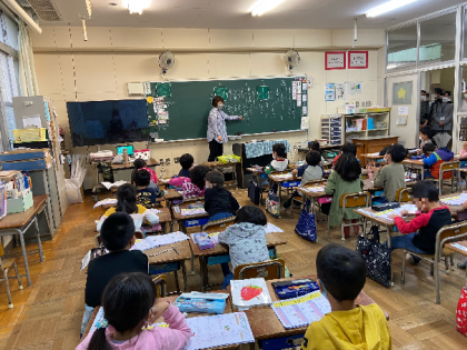 下記の写真は、午後(5時間目)の1年生の授業の様子です。国語科の学習をしています。