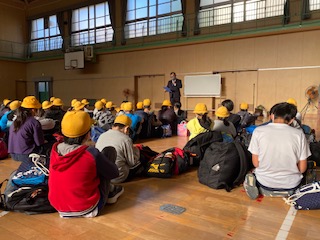 出発式で修学旅行のめあてを確認した後、元気にバスに乗りました。