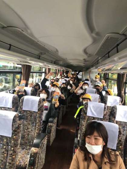 バスの中で開園時間まで待機中。
