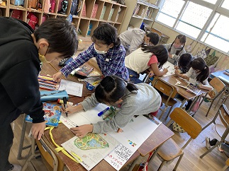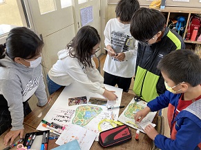 総合的な学習の時間で、先週の金曜日に行った遠足の『振り返り』をしました。子どもたちは、写真やマップを見ながら遠足の楽しい活動を思い出し、それぞれの班が画用紙にまとめました。班の友達とまとめ方について話し合ったり、発見したことや学んだことなどを他の班に伝え合ったりして、遠足の『振り返り』を楽しみました。