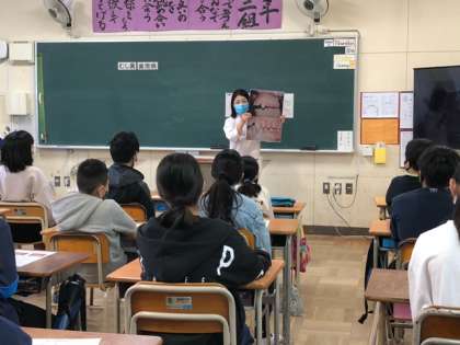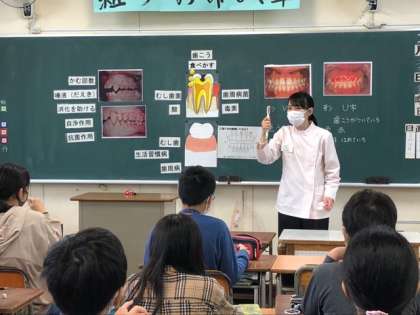 一口食べたときに何回かんでいるか、歯垢を取り除かなければ、むし歯や歯周病になってしまうこと、普段の生活習慣と歯みがきで、感染症の予防につながることを学びました。