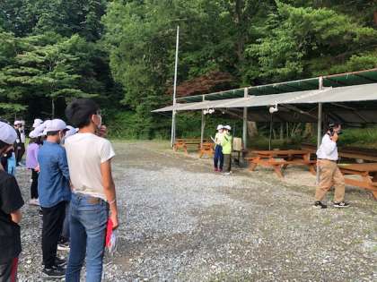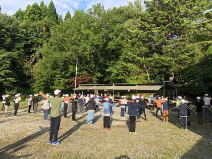 朝のあいさつの後、ラジオ体操で目覚まし中です。