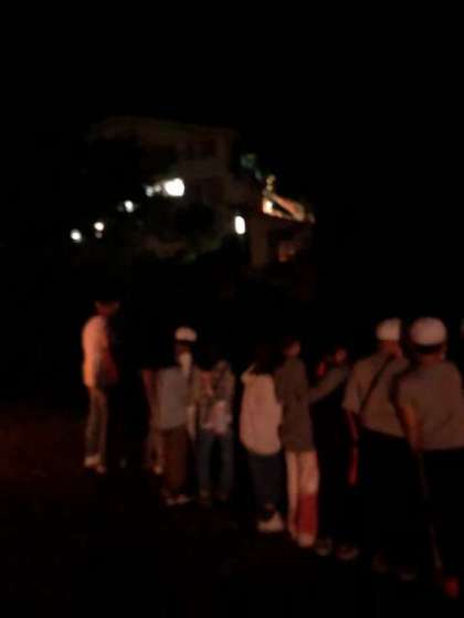 キャンプファイヤー終了後、ナイトハイクをしました。杉木立の中を歩くと真っ暗になり、怖がっている子もいました。不思議なハチ高原の妖精に出会った子もいました。