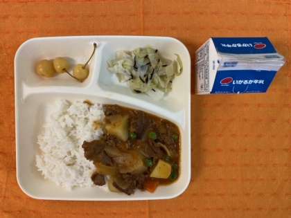 今日の給食は、ハヤシライス・牛乳・キャベツのひじきドレッシング・さくらんぼのかんづめです。
