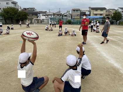 10月6日(水) 5年生は、ラグビーのプロチーム「NTTドコモ レッドハリケーンズ」をお招きしました。そして、『夢授業』を行っていただきました!内容は、1時間の講演と1時間半のラグビーの実技体験でした。プロラグビー選手のタックルの勢いや音に感動したり、リフトの高さに驚いたり、夢中になる活動ばかりでした。