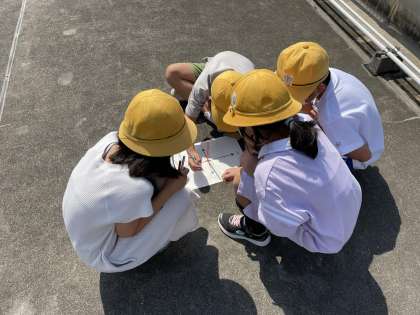 晴れた日に運動場へ行くと、自分や建物、植物といろいろなものにかげがあることを見つけました。かげには太陽が関係している!とみんなで考え、遮光板を使って太陽の位置を確認しました。また、時間が経つとかげが動いていることにも注目し、屋上に上がって時間ごとにかげや太陽の位置を調べました。