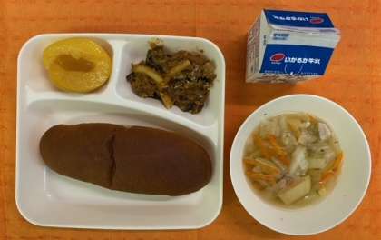 今日の給食は、黒糖パン・牛乳・なすのミートグラタン・鶏肉と野菜のスープ・黄桃(缶)