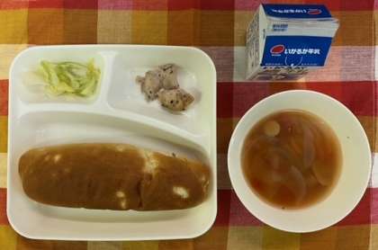 今日の給食は・おさつパン・牛乳・鶏肉の香草焼き・ウインナーとてぼ豆のスープ・キャベツのガーリックソテーです。