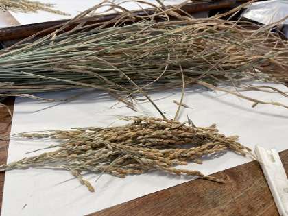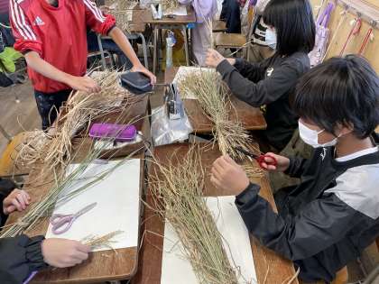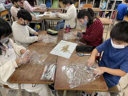11月11日(木) 味覚の秋を迎え、5年生が育ててきたバケツ稲は収穫の時期になりました。今回は、収穫した稲を1〜2週間干し、脱穀作業に取り組みました。昔の脱穀道具「千歯扱き」の使い方も確認し、とても意欲的に学べました。