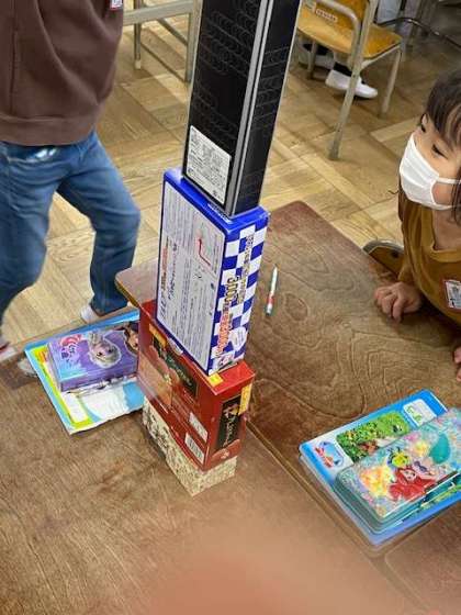 おうちから持ってきた箱を使ったり、教室にあるものを使ったりして、グループで協力していろんなものを作りました。