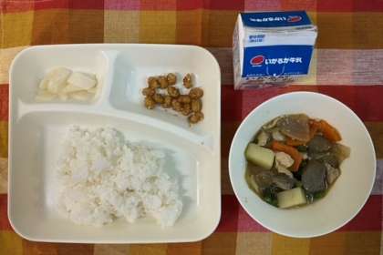 12月6日(月)の給食は、ご飯・牛乳・鶏肉と野菜の煮もの・じゃこ豆・かぶのゆず風味です。