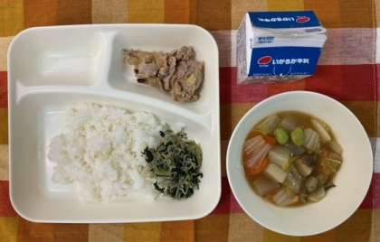 ちりめんじゃことだいこん葉でご飯を食べやすくし、にんにくと白みそで豚肉の風味よく焼きます。これに、旬の冬野菜を使いでん粉でとろみをつけたからだが温まる煮ものを組み合わせています。煮もののあつあげがおいしく温まる給食でした。