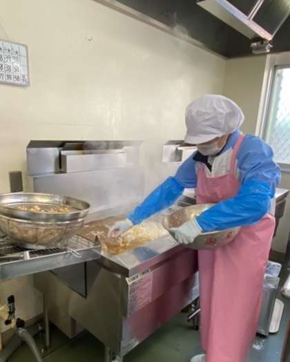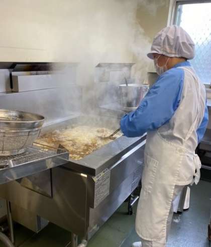 さけのマリネは、560人分のさけを調理員さんが1時間かけて揚げていました。