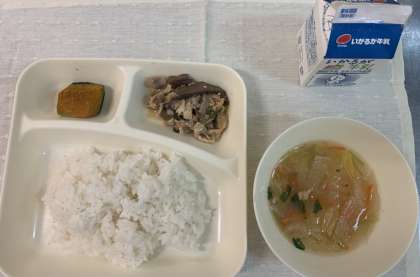 12月20日(月)の給食は、ごはん・牛乳・豚肉と干しずいきのみそ煮・うすくず汁・焼きかぼちゃのあまみつかけです。