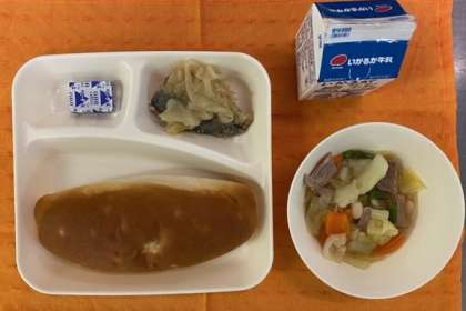 あじのレモンマリネは年に1回使うことのできるあじを油であげています。最後にレモン汁を入れて風味よく仕上げています。酸っぱいのが苦手な子もいましたが、魚がなくても玉ねぎだけお替りしている子のいました。