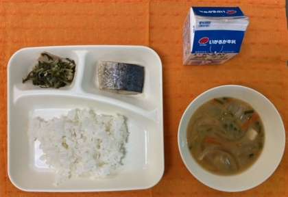 今日の給食は、ごはん・牛乳・さごしのしょうゆだれかけ・みそ汁・みずなの煮びたしです。