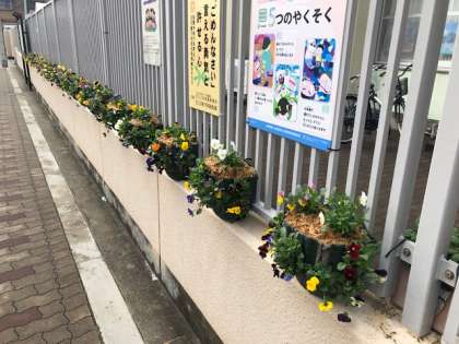 住之江区役所と安立地域の皆様が、卒業式や入学式に向けて、種から育てた花を正門前のフェンスに飾ってくださいました。長年続いている事業です。コロナの関係で、ここ2年間は安立小のそだてよう委員会の子どもたちと活動できていませんが、来年は一緒に活動できますように…
