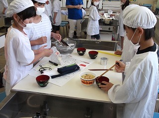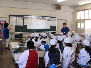 大阪ガスの方がゲストティーチャーとして来校してくれました。ラーメンを作って食べるという食生活の行動ひとつひとつが、地球環境問題のどの問題と関連しているか実験を通して考えました。ごみの減量実験や、ラーメンの選び、鍋選び、火力の選択などについて、環境問題と関連させて調理実験を行いました。