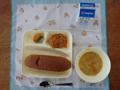 ♦にこみハンバーグ♦コーンとキャベツのスープ♦やきかぼちゃ♦こくとうパン♦牛乳