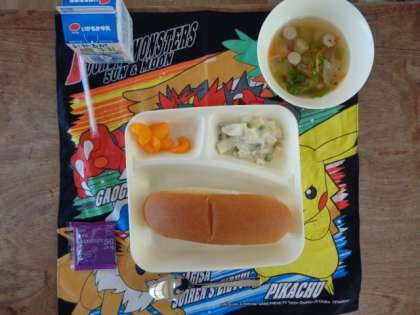 ♦マカロニグラタン♦レタスのスープ♦みかんのかんづめ♦コッペパン(添加物:ブルーベリージャム)♦牛乳