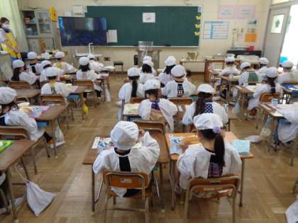 今日の給食には、鶏肉、マカロニ、たまねぎ、グリンピースなどを使った「マカロニグラタン」が出ました。