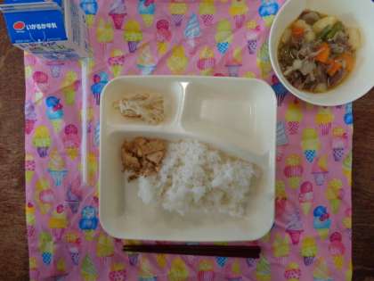 ♦にくじゃが♦もやしのゆずのかあえ♦ごまかかいため♦ごはん♦牛乳
