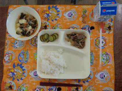 ♦プルコギ♦とうふとわかめのスープ♦きゅうりのあまずづけ♦ごはん♦牛乳