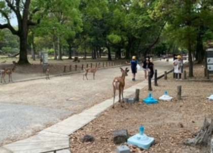 奈良公園に着いて、オリエンテーリングをしました。クイズを解きながらチェックポイントを巡りました。たくさんのシカに囲まれ、楽しみながらゴールの東大寺南大門にたどり着くことができました。