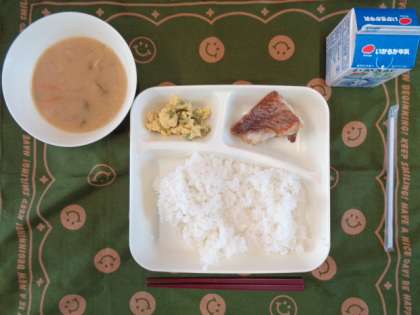 ♦あかうおのしょうゆだれかけ♦みそしる♦えんどうのたまごとじ♦ごはん♦牛乳