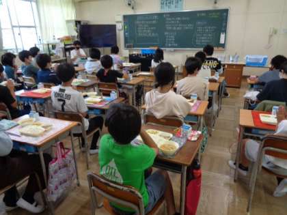 今日の「えんどうの卵とじ」のえんどうは、給食室で、さやから豆を取り出して調理しています。