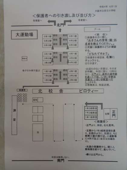 ・保護者の方は、「正門」から入って、小運動場に並んでいただき、「北門」から出ていただきます。