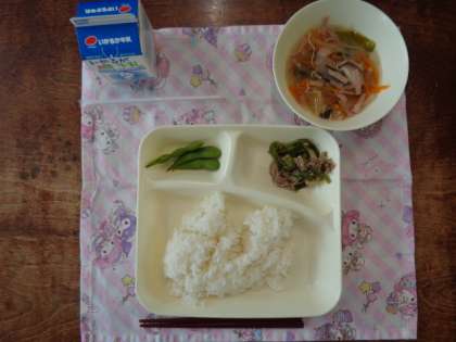 ♦チンジャオニューロウスー♦ハムとやさいのちゅうかスープ♦えだまめ♦ごはん♦牛乳