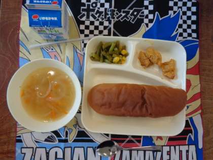♦けいにくのカレーマヨネーズやき♦てぼまめのスープ♦さんどまめとコーンのサラダ♦こくとうパン♦牛乳