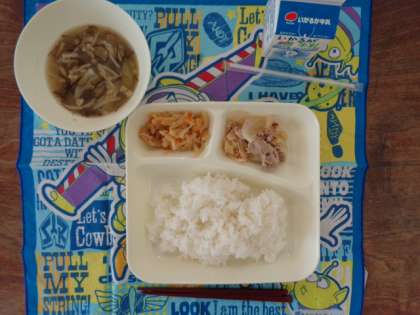 ♦ぶたにくのあまからやき♦もずくとオクラのとろりじる♦きりぼしだいこんのいために♦ごはん♦ぎゅうにゅう
