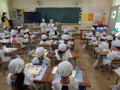 とうがんの実は、長さ30〜45センチメートルぐらいの大きさになります。給食では、煮もののほかにみそ汁やスープなどに使います。