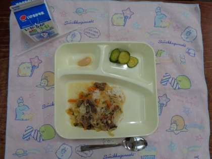♦ぎゅうどん♦きゅうりのしょうがづけ♦おおふくまめのにもの♦ごはん♦ぎゅうにゅう