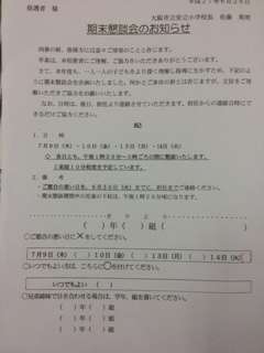 本日お配りいたしました「期末懇談会のお知らせ」で一部訂正箇所がありますので、お知らせいたします。切り取り線以下の「ご都合の悪い日に×をしてください。」の部分で、「14日(水)」の後ろの部分にかっこがありませんでした。つきましては、、「14日(水)」の後ろの部分に( )をつけて×印をしていただくか、日にちそのものに×印をつけてくださいますようお願いいたします。ご不便をおかけいたしますが、よろしくお願いいたします。教頭