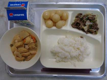 (今日の給食に、「一口がんもとさといものみそ煮」と「みたらしだんご」が出ました。)