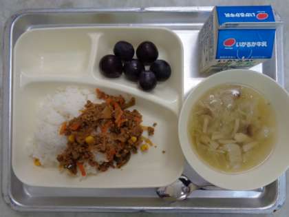 ♦やさいたっぷりカラフルライス♦キャベツときのこのスープ♦ぶどう(きょほう)♦ぎゅうにゅう